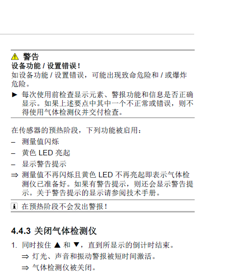 4.6運行準備 6 4.7在運行期間 6 4.7.1測量模式 6 4.7.2 警報 特殊狀態(tài) 鎖定警報 刪除峰值 4調(diào)出快速菜單 5調(diào)出信息 8測量 9 4.6.1帶泵測量時的特點 9 4.6.2帶泵測量 9 4.7配置設(shè)備設(shè)置 10 4.7.1激活日或夜模式 10 4.7.2更改設(shè)備語言 10 4.7.3設(shè)置日期及時間 10 4.7.4啟用靜音模式 10 保養(yǎng) 10 5.1維護周期 10 5.2標定間隔 10 5.3執(zhí)行功能測試 10 5.3.1通過向?qū)нM行功能測試 10 5.4標定氣體檢測儀 11 5.4.1進行新鮮空氣標定 11 5.5給電池充電 12 清潔 12 6.1設(shè)備設(shè)置 13 6.1.1出廠設(shè)置 13 6.1.2設(shè)備和傳感器設(shè)置 13 6.1.3警報設(shè)置 14 7 運輸 14 8 儲存 14 9.廢棄處理 14 10.技術(shù)數(shù)據(jù) 14 10.1氣體檢測儀 14 10.2有毒有害物質(zhì)名稱及含量 15 |