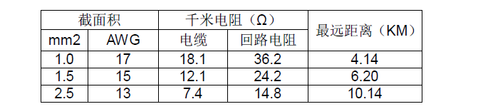 根據(jù)使用屏蔽線纜的技術(shù)參數(shù)可確定檢測儀的最遠傳輸距離,見下表: